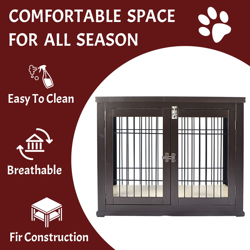 1. Güvenli ve endişesiz tasarım: Mobilya tarzı köpek kafesi Seçilmiş yüksek kaliteli ahşap ve düşük karbonlu çelik tel, çift güvenlik kapı kilitleri, evcil hayvan güvenliğinin çok yönlü korunması.